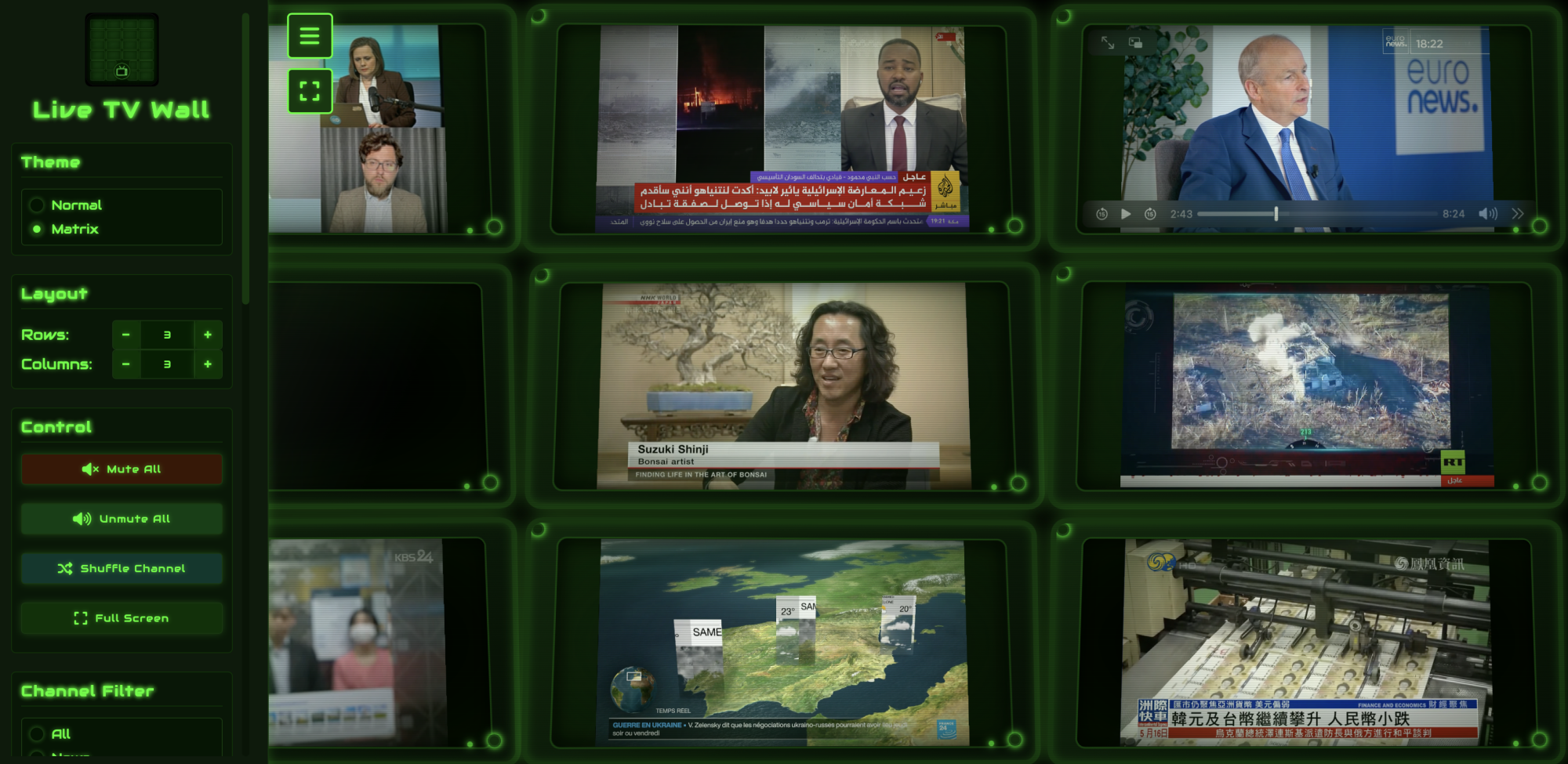Entra al sitio y verás nueve canales organizados en una cuadrícula de tres por tres. Un panel a la izquierda te permite personalizar el tamaño de la cuadrícula, si lo deseas, y también puedes desactivar el extraño encuadre estilo Matrix que rodea todos los televisores. Un botón de reproducción aleatoria te permite ver todos los canales nuevos o puedes desplazarte hacia abajo en el panel izquierdo para filtrar los canales por idioma o país.