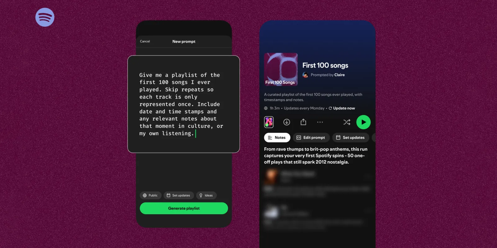 Por ejemplo, puedes configurarla para que cree una lista de reproducción con las canciones que tienes guardadas en tu biblioteca pero que aún no has escuchado. (Puede acceder a todo tu historial de Spotify). O puedes pedirle que seleccione canciones de una serie de televisión o película específica. (Utiliza información en tiempo real sobre cultura pop, listas de éxitos e historia).