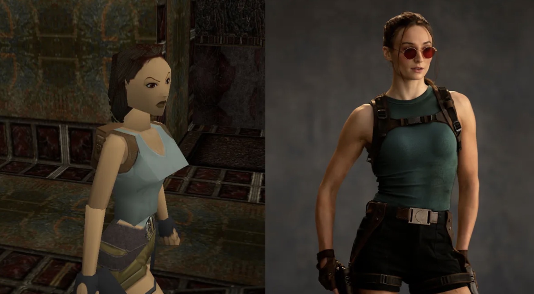 Interpretada por Sophie Turner (famosa por Juego de Tronos), la nueva Lara Croft de Tomb Raider luce todos los rasgos característicos del personaje, incluyendo su camiseta azul de tirantes y pantalones cortos, cabello castaño rojizo oscuro y fundas de pistola en los muslos. Los mechones de cabello que enmarcan el rostro son un sutil guiño a la representación de Angelina Jolie en 2001, mientras que sus icónicas gafas de sol circulares rojas completan el look.
