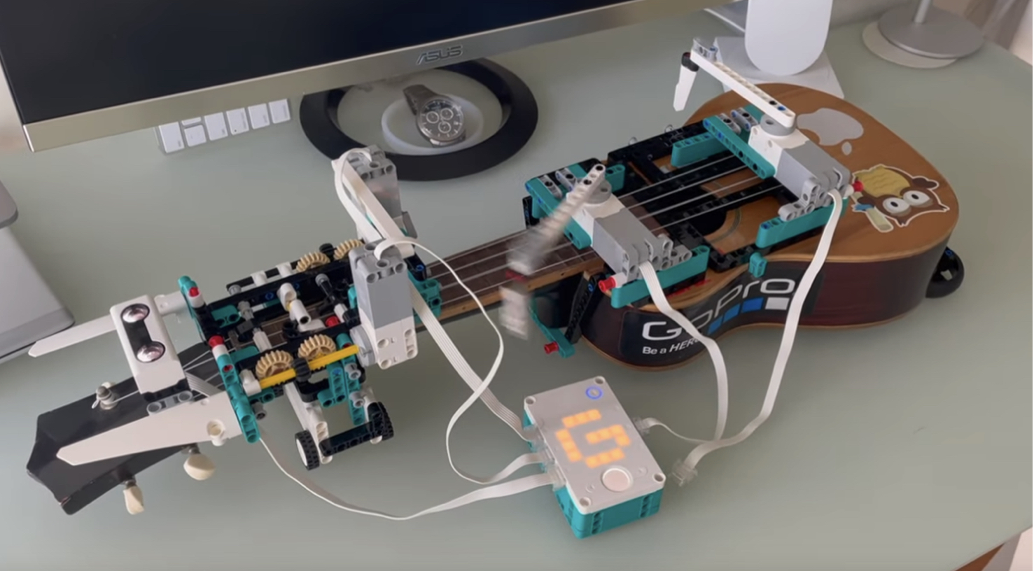 El video muestra un ukelele cubierto de bloques y conectores de Lego Mindstorms. Como se prometió en el título, su exoesqueleto de plástico se mueve por sí solo para reproducir el verso de «Can’t Help Falling In Love» presionando los trastes derechos y girando para rasguear las cuerdas por sí solo.